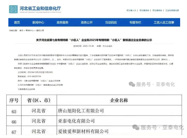 近日,河北省工業和信息化廳發布關于河北省第七批專精特新“小巨人”企業和2025年專精特新“小巨人”復核通過的企業名單,亞泰電化有限公司作為第四批認定的專精特新“小巨人”企業,憑借在細分領域的不斷積累與持續創新能力,順利通過2025年專精特新“小巨人”企業復核認定。此次復審通過,標志著公司在專業化發展、技術創新實力與未來成長潛力方面獲得了長足的進步,即是對企業以往成績的肯定,也是對未來企業發展的鞭策。