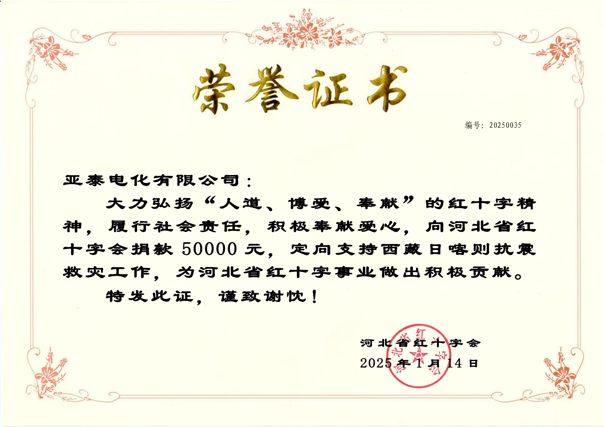 在公司領導的果斷決策下,第一時間從“亞泰愛心基金”中撥款5萬元人民幣,通過河北省紅十字會,定向支援西藏日喀則的抗震救災工作。我們希望通過這份綿薄之力,為災區人民帶去一絲溫暖和希望。